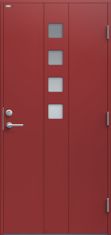 Ytterdörr i modern stil och dekorspår med djup profil i 6mm HDF-skiva. Fyra små, kvadratiska klarglas.