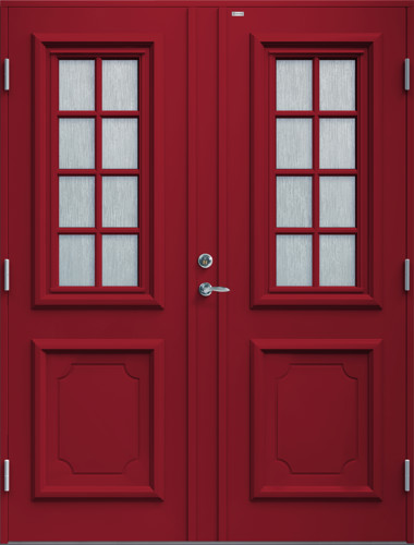 Parytterdörr i modern stil med slät yta utan dekor. Fyra små, kvadratiska klarglas per sida och rostfri sparkplåt.
