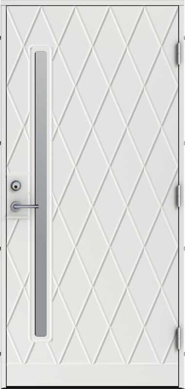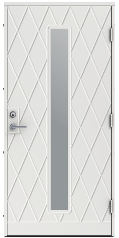 Dekorspårad ytterdörr i en modern nordisk stil med ett smalt centrerat stående klarglas.