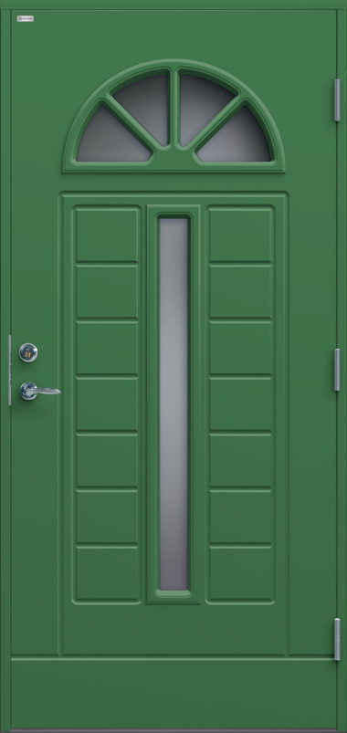 Dekorspårad ytterdörr i en modern nordisk stil ett smalt med stående klarglas.