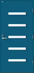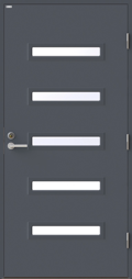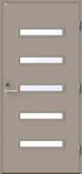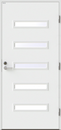 En dörr i modern stil med fem horisontella klarglas. Insidan är falsad, alltså en helt slät insida utan lister.