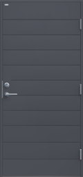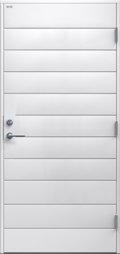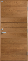 Dekorspårad ytterdörr i traditionell stil med liggande dekor.