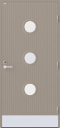 En dörr i modern stil med runda klarglas. Djupa stående dekorspår och en sparkplåt i aluminium.