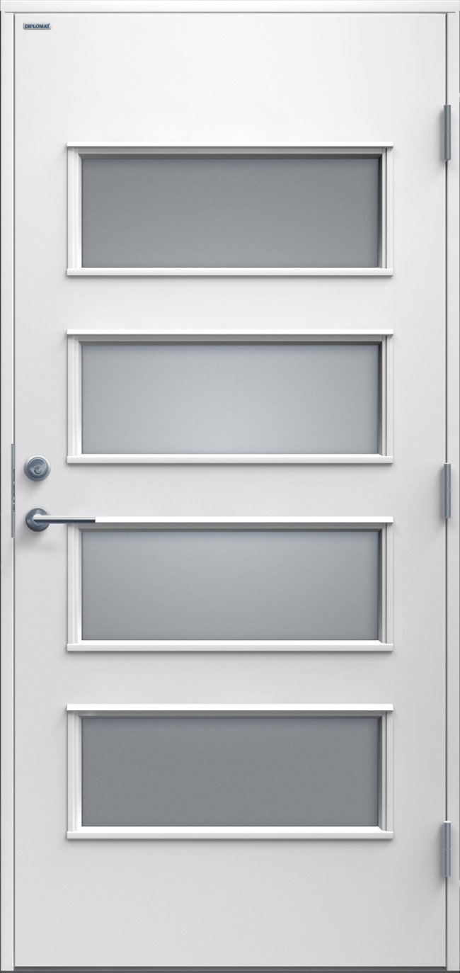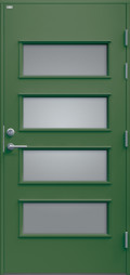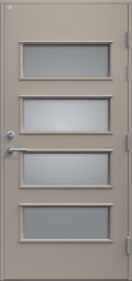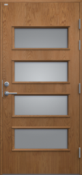 Elegant ytterdörr helt utan dekor. Dörren har fyra lite större, liggande klarglas. Välj mellan valfri kulör, konstteak eller ek.
