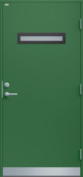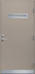Ytterdörr i modern stil utan dekor, försedd med liggande steppat klarglas med limmad glaskassett. Välj mellan glasram i svart eller silver. Rostfri sparkplåt medföljer. Byggd på laminatskiva som är mer väderbeständig och formstabil.