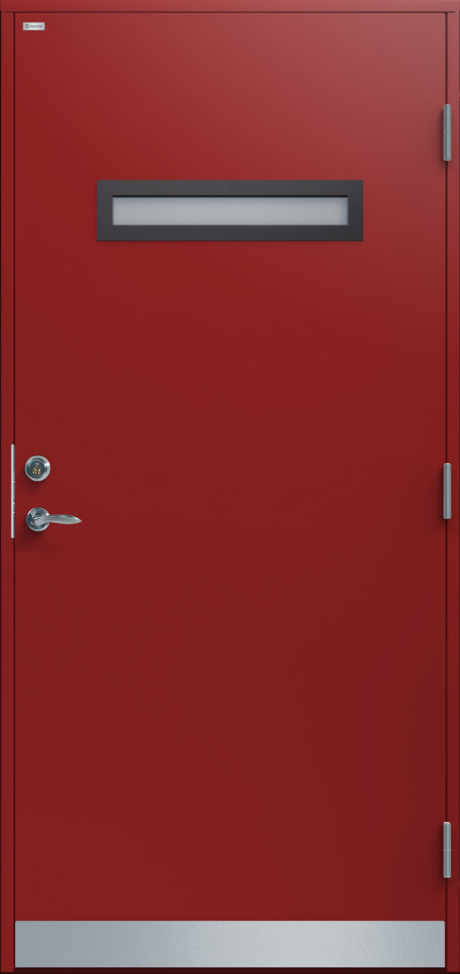 Ytterdörr i modern stil utan dekor, försedd med liggande steppat klarglas med limmad glaskassett. Välj mellan glasram i svart eller silver. Rostfri sparkplåt med följer. Byggd på laminatskiva som är mer väderbeständig och formstabil.