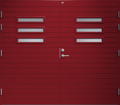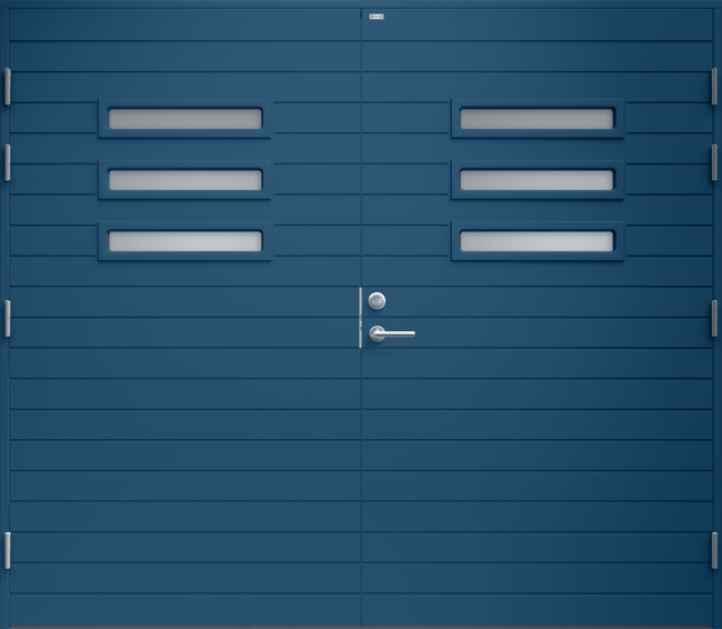 Garagedörr i modern stil med tre horisontella klarglas per sida. Spårfräst dekor i form av liggande panel. Finns i valfri kulör.
