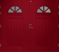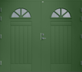 Garagedörr i klassisk stil med spårfräst dekor samt två halvcirkelformade cotswoldglas med dekorspröjs.