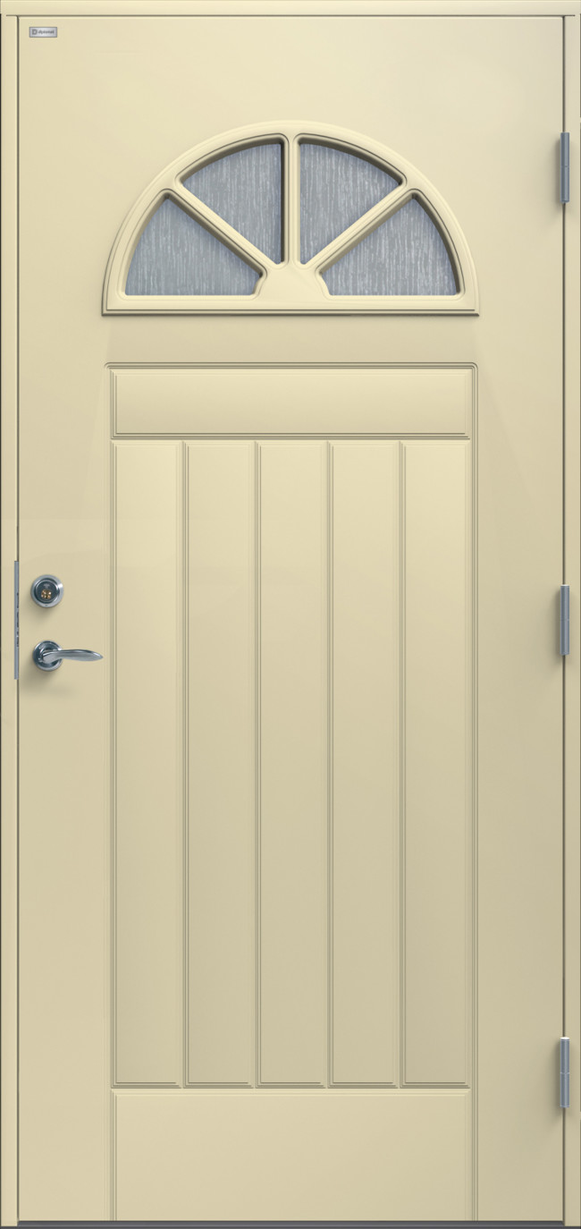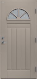 Ytterdörr i klassisk stil med spårfräst dekor samt halvcirkelformat cotswoldglas med dekorspröjs.