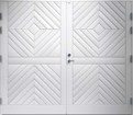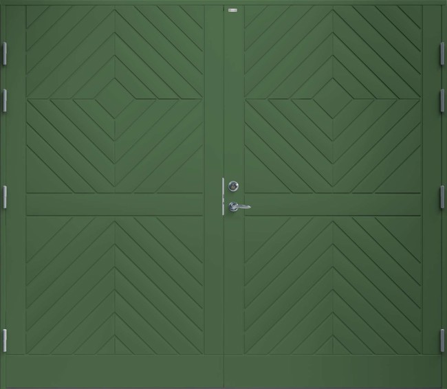 Garagedörr i traditionell stil med diagonal panel i form av spårfräst dekor. Välj mellan valfri kulör eller furu.