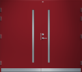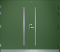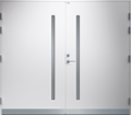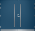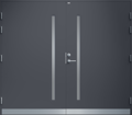 Garagedörr i modern stil med slät yta helt utan dekor. Två smala, stående klarglas och rostfri sparkplåt.