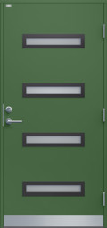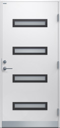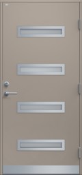 Ytterdörr i modern stil utan dekor. Byggd på laminatskiva som är extra väderbeständig och formstabil. Fyra liggande klarglas i steppat utförande med limmad glaskassett, välj mellan glasram i svart eller silver. Rostfri sparkplåt.
