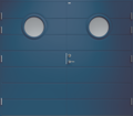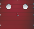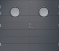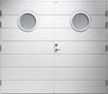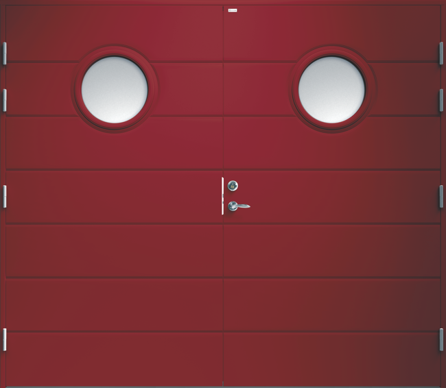 Garagedörr i traditionell stil med liggande dekorspår och två runda klarglas.