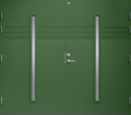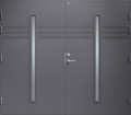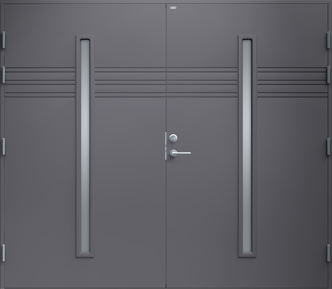 Garagedörr i modern stil med sparsam dekor. Två smala, stående klarglas.