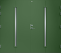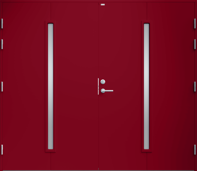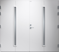 Garagedörr i modern stil med sparsmakad dekor och två smala, stående klarglas.